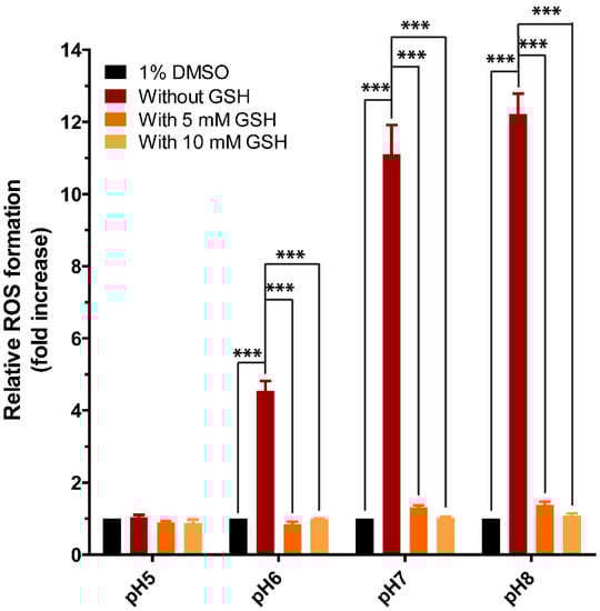 3.6. Cell-Free ROS Formation in Incubations of Purpurin with GSH at Different pH