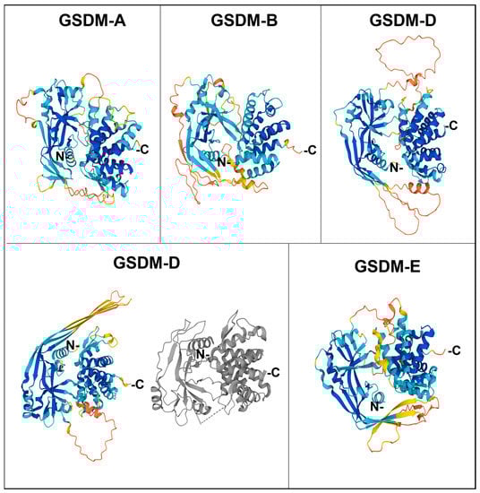 Structure of human gasdermins. The colored figures correspond to the predicted structures by AlphaFold, with the following model of confidence: blue, Very high (pLDDT > 90); cyan, Confident (90 > pLDDT > 70); yellow, Low (70 > pLDDT > 50), and orange, Very low (pLDDT < 50). For gasdermin D, the most studied one, the structure of the crystallized protein from PDB is also shown (in grey).