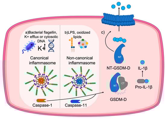 Depending on the type of stimulus or threat, either the canonical inflammasome or the non-canonical inflammasome will be activated [46]. Canonical inflammasomes recognize signals such as bacterial flagellin, K+ efflux, or cytosolic DNA that activate caspase-1. Conversely, non-canonical inflammasomes recognize bacterial lipopolysaccharides (LPSs), present in the outer membrane of Gram-negative bacteria, or oxidized lipids, which activate caspase-11, caspase-4, or caspase-5 [22]. Regardless of the type of activation pathway, membrane pore formation and interleukin release will be achieved due to GSDMD cleavage. GSDMD pore formation has also been linked to IL-33 release [47].