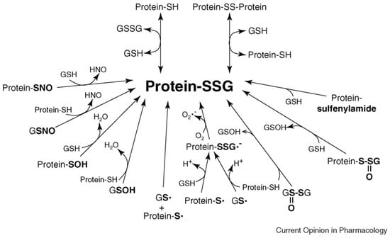 Likely mechanisms of protein glutathionylation within cells involve a reaction of the thiol moiety of protein-SH or GSH with a corresponding oxidized derivative; e.g., sulfenic acid (–SOH), thiyl radical (–S•), S-nitrosyl (–SNO), thiosulfinate (–S(O)SR), or sulfenyl-amide (cyclic-S–N–CO–). Oxidized sulfhydryl derivatives are proposed to form during normal redox signaling, pathological oxidative stress, and/or treatment with xenobiotic/pharmacological agents. Exposure of proteins and cultured cells to such reactive sulfhydryl intermediates is shown to lead to protein-SSG formation in vitro. Determining the importance of these glutathionylation mechanisms in vivo requires evaluation of the chemistry and biochemistry, including thermodynamic and kinetic competence, particularly under conditions that mimic the intracellular milieu. For additional details, see [24]. (Reproduced with permission [24]).