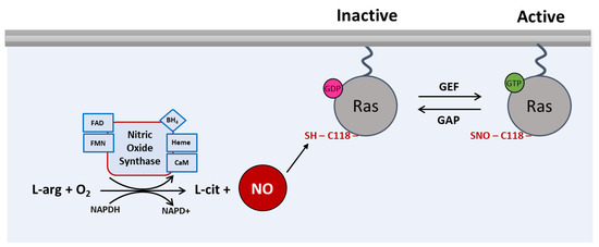 - Batista, W.L.; Ogata, F.T.; Curcio, M.F.; Miguel, R.B.; Arai, R.J.; Matsuo, A.L.; Moraes, M.S.; Stern, A.; Monteiro, H.P.; Rychter, M.; et al. S-Nitrosoglutathione and Endothelial Nitric Oxide Synthase-Derived Nitric Oxide Regulate Compartmentalized Ras S-Nitrosylation and Stimulate Cell Proliferation. Antioxid. Redox Signal. 2013, 18, 221–238. [Google Scholar] [CrossRef]