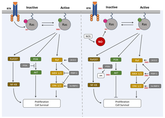 - Lander, H.M.; Ogiste, J.S.; Pearce, S.F.A.; Levi, R.; Novogrodsky, A. Nitric Oxide-stimulated Guanine Nucleotide Exchange on p21ras. J. Biol. Chem. 1995, 270, 7017–7020. [Google Scholar] [CrossRef] [PubMed]