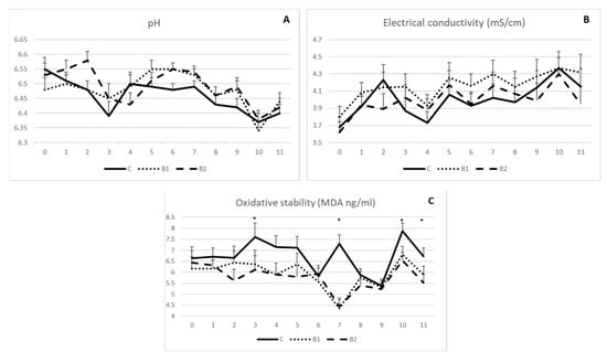 As indicated in Figure 2A,B, milk pH and electrical conductivity were not influenced by MPBC dietary supplementation, since no significant differences were observed among the experimental groups during the 11-week experimental period. On the other hand, milk oxidative stability was in general improved in MPBC supplemented groups as shown by the reduced MDA values. Significant differences were shown on week 3, 7, 10 and 11 (p < 0.05; Figure 2C). The respective MDA values (ng/g) were 6.36 and 6.11 vs. 7.60 (±0.64) on week 3, 4.35 and 4.44 vs. 7.29 (±0.40) on week 7, 6.81 and 6.54 vs. 7.87 (±0.36) on week 10 and 5.89 and 5.52 vs. 6.72 (±0.29) on week 11 for the B1, B2 and C groups, respectively (p < 0.05; Figure 2C).
