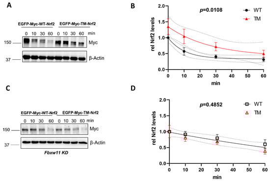 The main degradation pathways of Nrf2 are (a) the KEAP1-dependent pathway and (b) the KEAP1-independent pathways, involving the βTrCP E3 ubiquitin ligase subunit of the SCFβΤrCP complex. To address whether the previously identified phospho-sites of Nrf2 have a role in the stability of the protein in the context of βTrCP-mediated degradation, we used KEAP1-depleted mouse embryonic fibroblasts (MEFs) to overcome KEAP1 interference. Cells were transfected with a wild form of Nrf2 (GFP-MYC-WT-Nrf2) or a triple mutated version of Nrf2 (GFP-MYC-TM-NRF2) in which S374, S408, and S433 were mutated to alanine. To monitor the time-dependent decay of Nrf2 protein, de novo protein synthesis was blocked by treatment with cycloheximide. The triple mutated form of Nrf2 had a higher half-life in comparison to the wild-type form (~18 min vs. 7 min) (Figure 1A,B). This finding showed that mutation of the identified phospho-sites renders the protein more stable and less susceptible to degradation. To further investigate whether the increased stability of TM-Nrf2 was indeed related to βTrCP-mediated degradation, we knocked down βTrCP2 by siRNA and repeated the experimental setup from above. Downregulation of βTrCP2 resulted in similar kinetics of degradation between the WT-Nrf2 and the TM-Nrf2 (Figure 1C,D). These data suggest that the identified residues control the abundance of Nrf2 in a βTrCP2-dependent manner. Successful depletion of endogenous mouse βTrCP2 by Fbxw11 siRNA was confirmed by immunoblot in transfected MEFsKeap1−/− (Figure S1).