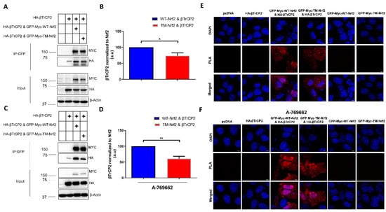 To further corroborate the role of phospho-S374, -S408, and -S433 in βTrCP2-mediated degradation of Nrf2, we tested the binding of βTrCP2 to Nrf2. We addressed this question by employing a co-immunoprecipitation and proximity ligation assay (PLA) in Keap1−/− cells transfected with GFP-Myc tagged WT or TM-Nrf2 and HA-tagged βTrCP2. Notably, in co-immunoprecipitation experiments, βTrCP2 interacted to a lower extent with TM-Nrf2 than with WT-Nrf2 (Figure 2A,B), and this impaired interaction became even more apparent in the presence of A-769662, an allosteric AMPK activator (Figure 2C,D). Accordingly, PLA experiments confirmed that Nrf2 interaction with βTrCP2 is impeded upon substitution of the identified serine residues to alanine (Figure 2E). This effect was again pronounced upon AMPK activation by A-769662: whereas WT-Nrf2-transfected cells gave a bright signal, notably predominantly in the nucleus, TM-Nrf2 transfected cells displayed rather low fluorescence (Figure 2F). To exclude experimental artifacts, cells solely expressing either WT-Nrf2, TM-Nrf2, βTrCP2, or pcDNA served as controls. Also, an interaction was exclusively detected between transfected Nrf2 and transfected β TrCP2 since the MYC-Tag of Nrf2 and the HA-Tag of β TrCP2 served as the targets of the PLA primary antibodies. These results so far supported the notion that phosphorylation of S374, S408, and S433 supports Nrf2 degradation by facilitating its interaction with βTrCP2.