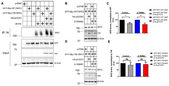 Considering that βTrCP2 is an E3 ubiquitin ligase, we further tested whether its reduced binding to TM-Nrf2 is also reflected by reduced TM-Nrf2 ubiquitination compared to WT-Nrf2. Ubiquitination experiments in KEAP1-depleted MEFs suggested that co-expression of βTrCP2 with wild-type Nrf2, but not with the triple mutated form, resulted in increased ubiquitination of Nrf2 (Figure 3A). Regarding βTrCP2-mediated regulation of Nrf2 protein levels, transient co-transfection of GFP-MYC-WT-Nrf2 with βTrCP2 in MEFsKeap1−/− led to a reduction in the protein levels of WT-Nrf2, and this downregulation was additionally enhanced in the presence of A-769662 (Figure 3B,C). However, mutation of the identified AMPK-dependent phospho-sites in TM-Nrf2 rendered the protein resistant to degradation by co-transfected βTrCP2 and insensitive to AMPK activation (Figure 3D,E). These data corroborate that AMPK-dependent S374, S408, and S433 residues favor the degradation of Nrf2 by facilitating its ubiquitination by βTrCP2.