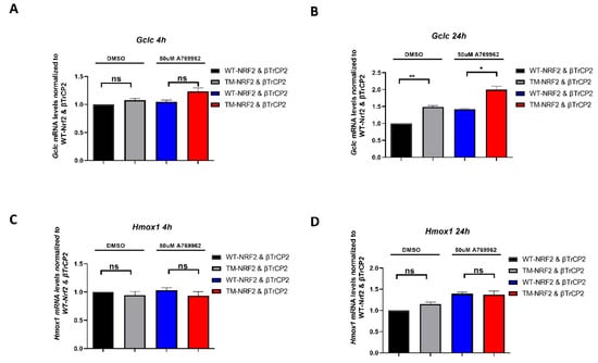 To see whether the aforementioned observations are also of relevance for Nrf2 target gene expression, we examined WT-Nrf2- and TM-Nrf2-mediated transactivation in our model system of MEFsKeap1−/− co-transfected with a βTrCP2 expression plasmid. Specifically, we investigated the transactivation of endogenous Hmox1 (heme oxygenase 1) and Gclc (Glutamate-cysteine ligase catalytic subunit) [,] in the presence or absence of A-769662 at two time points. Hmox1 was expressed to a similar extent by both Nrf2 forms with or without AMPK activation at 4 h (Figure 4C) and 24 h (Figure 4D). Of note, whereas mRNA levels of Gclc exhibit similar expression in the presence of either Nrf2 form irrespective of AMPK activation at 4 h (Figure 4A), Gclc mRNA was significantly elevated in the case of ΤΜ-Nrf2 in comparison to WT-Nrf2 at 24 h (Figure 4B), suggesting that the more stable TM-Nrf2 also leads to a more sustained Gclc expression. Of note, A-769662 elicited elevated mRNA levels of Gclc both in the WT- and the TM-Nrf2 setting. This could likely be attributed to other AMPK-dependent signals besides S374, S408, and S433 phosphorylation that can still positively affect the (endogenous) Nrf2-dependent gene transcription in our model, such as phosphorylation of Nrf2 on Ser558, which has been shown to induce nuclear accumulation of Nrf2 []. Overall, our findings suggest that AMPK-dependent phosphorylation of S374, S408, and S433 is involved in βTrCP2-mediated control of Nrf2 protein levels and activity, which may gain increased importance in a KEAP1-deficient background.