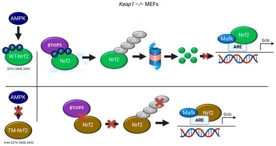Working model depicting the role of the AMPK-dependent S374, S408, and S433 of Nrf2 in its βTrCP2-mediated ubiquitination and degradation, regulating the expression of Nrf2 target genes (©BioRender).