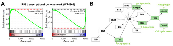 Association of p53 pathway and apoptotic genes with liver fibrosis. (A) GSEA plots displaying the upregulation of genes associated with the ‘P53 transcriptional gene network’ in liver tissues of the DMN group (n = 1) compared to the normal group (n = 1) and their downregulation in the oligonol-treated DMN group compared with the DMN group (n = 1). (B) A gene network representing gene–gene interaction associated with p53-related apoptotic genes in the burn-wound-healing pathway. Genes involved in both apoptosis and the p53 signaling pathway are colored green. DMN, dimethylnitrosamine; NESs, normalized enrichment scores.