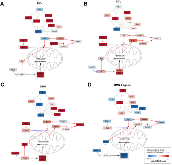 Transcriptomic changes in p53-associated apoptotic signaling in burn-wound-healing pathway. (A–D) Gene–gene network representing the relationships between genes involved in p53-induced apoptotic signaling in burn-wound-healing pathway. A node represents a gene and an edge represents an interaction between genes. Nodes are colored based on their expression changes (log2 fold change) following (A) BDL, (B) CCI4, (C) DMN, and (D) DMN + oligonol treatments.