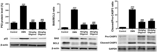 Protein levels of p53-associated apoptotic mediators perturbed by DMN and oligonol treatment. Western blot analyses of p53, BAX/BCL2 ratio, and cleaved/pro-CASP3 ratio in liver tissues from DMN and oligonol groups. Bar plots show the mean and standard error of the mean (SEM) (n = 3) values per group. *** p < 0.001 vs. the control group, and ### p < 0.001 vs. the DMN group.