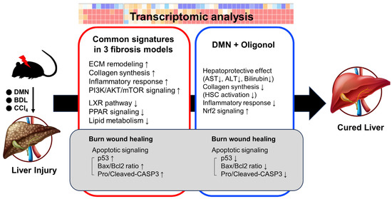In this study, we took advantage of three independent liver fibrosis models and investigated their transcriptome data to understand the pathological mechanisms behind hepatic fibrosis. We compared the common gene signatures of liver fibrosis with those of oligonol-treated liver fibrosis and identified significant changes in apoptotic genes within the wound-healing pathway in liver fibrosis.