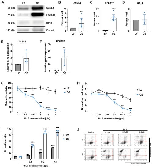 HEK293T cells were stably transfected using the sleeping beauty system [] with an empty vector or overexpression of the enzymes ACSL4 and LPCAT2, resulting in an average of 3.5-fold overexpression of ACSL4 and 18-fold overexpression of LPCAT2 detected in Western blot analyses (Figure 1A–C). The protein expression levels of the selenoprotein GPx4 (Figure 1D) and the system Xc− (Supplementary Figure S1A,B) were not altered in OE cells compared to LV controls. Relative gene expression levels of ACSL4 and LPCAT2 were quantified by qPCR, revealing 2-fold higher mRNA levels of ACSL4 and, on average, 40-fold higher LPCAT2 levels in the overexpressing cells compared with empty vector control cells (Figure 1E,F). To evaluate the effects of the ACSL4/LPCAT2 overexpression on cell viability, both cell lines were treated with different concentrations of the GPx4 inhibitor RSL3 reaching from 10 nM to 4 µM. The MTT assay illustrates a significant reduction in the metabolic activity after 16 h of RSL3 exposure in the OE cells, even at the lowest applied RSL3 concentration of 100 nM, whereas LV cells remained largely unchanged (Figure 1G). These results were confirmed by real-time impedance measurements (Figure 1H and Supplementary Figure S2A) and by detecting cell death through propidium iodide (PI) staining and flow cytometry (Figure 1I,J), demonstrating that the OE cell line was considerably more sensitive to RSL3 compared to the control cell line, due to the overexpression of the ACSL4 and LPCAT2. The LV cells also responded to the ferroptosis inducer, however, at considerably higher concentrations of RSL3 and with reduced sensitivity compared to the ACSL4/LPCAT2 OE cell line. It should be noted that the required concentrations of RSL3 to induce ferroptosis varied due to density or passage-dependent differences that affected the responsiveness of the cells to the ferroptosis stimulus between the experiments. However, the relative difference in sensitivity to ferroptosis between OE and LV cells was very robust and highly reproducible and served as a consistent and reliable reference point for comparison, irrespective of the specific RSL3 concentrations used.
