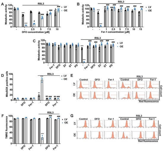 DFO and Fer-1 prevent ACSL4/LPCAT2 OE cells from increased mitochondrial ROS production and loss of mitochondrial membrane potential and metabolic activity. Metabolic activity of HEK293T cells was evaluated by MTT assays after 16 h of treatment with (A) 0.8 µM RSL3 and co-treatment with 2.5–10 µM deferoxamine (DFO); (B) 0.18 µM RSL3 and co-treatment with 1–15 µM ferrostatin-1 (Fer-1); and (C) 0.2 µM RSL3 and co-treatment with 10 µM Fer-1, 10 µM DFO, 10 µM zileuton (Zil), 0.5 µM ST1853 (ST) and 5 µM PD146176 (PD). Data are shown as percentage of control condition of n = 8 replicates. (D) Mitochondrial ROS formation and (F) mitochondrial membrane potential were quantified by FACS analysis of MitoSOX or TMRE stained cells after 0.2 µM RSL3 and co-treatment with 10 µM DFO and Fer-1 for 16 h (5000 cells per replicate of n = 3 replicates, percentage of gated cells). (E,G) Histograms of the respective FACS measurements with gating. *** p < 0.001; ** p < 0.01 compared to control condition, ### p < 0.001; ## p < 0.01; and # p < 0.05 compared to RSL3-treated control condition (ANOVA, Scheffé’s test).