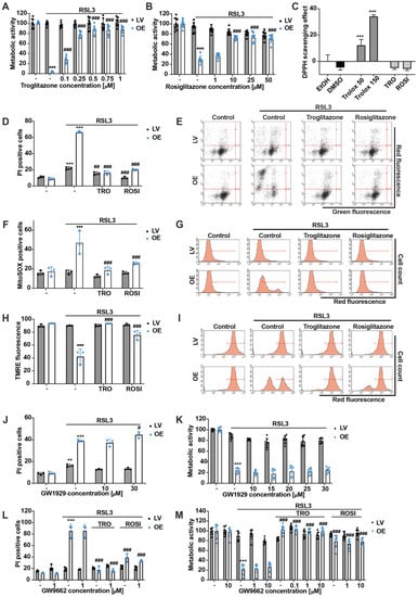 Troglitazone and Rosiglitazone inhibit ferroptosis in ACSL4/LPCAT2 overexpressing cells. (A,B) Metabolic activity was determined by MTT assay after 16 h of exposure to 0.1 µM or 0.5 µM RSL3 and co-treatment with 0.1–1 µM troglitazone (TRO) and 1–50 µM rosiglitazone (ROSI). Data are shown as percentage of control conditions of n = 8 replicates. (C) For the determination of antioxidant properties of the substances, a DPPH assay was performed with 50 µM and 150 µM Trolox, 0.25 µM TRO, and 25 µM ROSI. Data are given as mean ± SD (n = 3 replicates). (D) Cell death, (F) mitochondrial ROS formation, and (H) mitochondrial membrane potential were quantified by FACS analysis of PI, MitoSOX, or TMRE stained cells after co-treatment of 0.25 µM TRO and 25 µM ROSI with 0.1, 0.15, or 0.5 µM RSL3 for 16 h (5000 cells per replicate of n = 3 replicates, calculated as percentage of gated cells). (E,G,I) Representative dot plots or histograms of the respective FACS measurements with gating. Cell death measured by PI staining after 16 h treatment of (L) 1 µM RSL3 co-treated with 1 µM GW9662, 0.25 µM TRO, and 25 µM ROSI and (J) 0.1 µM RSL3 co-treated with 10 µM and 30 µM GW1929 (5000 cells per replicate of n = 3 replicates, percentage of gated cells). MTT assays of HEK293T cells after 16 h treatment with (M) 0.6 µM RSL3 and co-treated with 0.1, 1, or 10 µM GW9662 and 0.25 µM TRO or 25 µM ROSI and (K) 1 µM RSL3 with 10–30 µM GW1929 were evaluated. Data are shown as percentage of control conditions, n = 8 replicates. *** p < 0.001; ** p < 0.01 compared to control conditions, ### p < 0.001; ## p < 0.01; and # p < 0.05 compared to RSL3-treated control cells (ANOVA, Scheffé’s test).