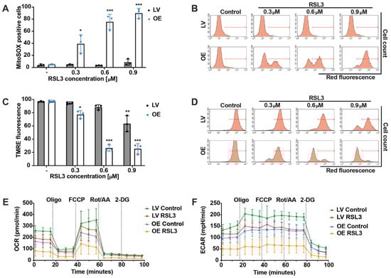 Based on the previous findings, we were interested in assessing if, under conditions of ACSL4/LPCAT2 overexpression, mitochondria were significantly involved in the enhanced sensitivity of the HEK293T cells against ferroptosis. For this purpose, we used the MitoSOX marker for specific detection of mitochondrial superoxide formation. In line with the effects on cell viability, RSL3 significantly enhanced mitochondrial ROS production in OE cells. In contrast, mitochondrial ROS accumulation was not detected in the LV cells after 16 h of RSL3 treatment (Figure 4A,B). When measuring mitochondrial membrane potential using the fluorescent dye TMRE, a slight decrease in MMP was detected at the highest RSL3 concentration in the LV control cells. Nevertheless, the OE cells revealed a massive loss of mitochondrial membrane potential after exposure to RSL3 (Figure 4C,D). For the detection of energy metabolism, the Seahorse XFe96 analyzer was used to quantify mitochondrial respiration by measuring the oxygen consumption rate (OCR) as well as glycolysis by detecting the extracellular acidification rate (ECAR). These measurements displayed that the ACSL4 and LPCAT2 overexpressing cells exerted slightly lower basal respiration and glycolysis rates in comparison to control cells (Figure 4E,F). RSL3 treatment resulted in a reduced mitochondrial respiration and glycolysis rate in both cell lines, with the OE cells exhibiting a more pronounced decrease in both ECAR and OCR after 16 h of treatment compared to LV controls. These results imply that mitochondria play an essential role in RSL3-mediated ferroptosis in ACSL4/LPCAT2 overexpressing HEK293T cells, and that increased sensitivity to ferroptosis was also associated with severe mitochondrial damage.