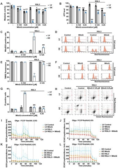 Mitochondrial ROS scavenging by mitoquinone prevents RSL3-mediated ferroptosis in ACSL4/LPCAT2 OE cells. (A) Metabolic activity and (B) ATP levels were determined by MTT or ATP assay after 16 h treatment with 0.1 µM RSL3. Data are shown as percentage of control conditions, n = 8 replicates. (C) Mitochondrial ROS formation, (E) mitochondrial membrane potential, and (G) cell death were quantified by FACS analysis of MitoSOX, TMRE, or PI-stained cells after co-treatment with 0.125 µM or 0.25 µM mitoquinone (MitoQ) and 0.4 µM (MitoSOX) or 0.8 µM RSL3 (TMRE, PI) for 16 h (5000 cells per replicate of n = 3 replicates, percentage of gated cells). (D,F,H) Representative histograms, or dot plots of the respective FACS measurements with gating. (I,K) Mitochondrial respiration and (J,L) glycolysis measurements by the seahorse XF analyzer of LV (I,J) and OE (K,L) cells treated with 0.4 µM RSL3 and co-treated with 0.25 µM MitoQ for 16 h (n = 5–8 replicates per condition). *** p < 0.001 compared to control condition, ### p < 0.001; # p < 0.05 compared to RSL3-treated control condition (ANOVA, Scheffé’s test).