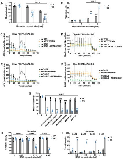 Since scavenging of mitochondrial ROS production and protection against ACSL4/LPCAT2-driven ferroptosis by MitoQ was associated with reduced mitochondrial respiration and shift of energy metabolism towards glycolysis, we aimed to determine whether metabolic intervention alone, i.e., independent of any antioxidant properties, would be sufficient for protection against ferroptosis in the OE cells. We, therefore, applied metformin to shift energy metabolism from mitochondrial OXPHOS to an increase in aerobic glycolysis. Surprisingly, metformin reduced metabolic activity in RSL3-treated cells to a greater extent compared to RSL3 treatment alone in both cell lines (Figure 6A), which was confirmed by the cell death measurement even showing enhanced cell death after metformin treatment instead of protection (Figure 6B). Furthermore, metformin decreased OCR in the LV control cells under basal culture conditions, and OCR was completely shut down after co-treatment of metformin and RSL3 (Figure 6C). Again, the OE cells were even more responsive to metformin than LV cells, resulting in a total deactivation of the respiration by metformin already under basal culture conditions (Figure 6E). The ECAR of the LV cells slightly increased after co-administration of metformin and RSL3, compared to the RSL3 treatment alone (Figure 6D). Treating the OE cells with the ferroptosis inducer did not change the glycolytic rate, whereas co-treatment with metformin downregulated glycolysis (Figure 6F). Overall, metabolic intervention by metformin not only failed to prevent ACSL4/LPCAT2-driven ferroptosis but exacerbated mitochondrial respiratory impairment and cell death. In addition, phenformin, another biguanide agent, was tested in this model system, also failing to exert any protective effects (Figure 6G and Supplementary Figure S5). Another attempt was to inhibit the succinate dehydrogenase (SDH), i.e., complex II of the respiratory chain, with the compounds itaconate and the cell-permeable itaconate derivative 4-octyl itaconate (4OI). However, no effects were detected with the complex II inhibitors either (Figure 6G). Finally, because glutamine is known to be pivotal for mediating mitochondrial pathways of ferroptosis through metabolic effects [], LV and OE cell lines were challenged with the ferroptosis inducer RSL3 in conditions of glutamine deprivation. The results showed that under basal conditions of glutamine deprivation, the metabolic activity of the cells was unaffected, whereas after RSL3 treatment, reduced glutamine concentrations resulted in significantly decreased metabolic activity in the OE cells (Figure 6H). Moreover, glutamine deprivation did not attenuate ferroptosis in ACSL4/LPCAT2-OE HEK293T cells (Figure 6I), indicating that glutaminolysis and the accompanying metabolic activity in mitochondria were not required in ACSL4/LPCAT2-driven ferroptosis in the HEK293T cells.