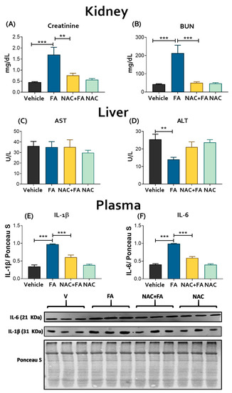 Evaluation of renal damage markers: (A) Creatinine and (B) blood urea nitrogen (BUN) evaluated in plasma; the analysis was conducted on day 7 of evolution (48 h after the last FA administration) using commercial kits. The results are expressed in milligrams per deciliter (mg/dL). Evaluation of liver damage markers: (C) aspartate aminotransferase (AST) and (D) alanine aminotransferase (ALT) in plasma; the analysis was conducted on day 7 of evolution using commercial kits, and the results are expressed in units of the corresponding assays per liter (U/L). Evaluation in plasma of proinflammatory cytokines by Western blot and its densitometry: (E) interleukin one beta (IL-1β) and (F) interleukin six (IL-6). Ponceau S Staining of the corresponding membranes was used as a control charger. Data are mean ± SEM, n = 5–6. ** p < 0.01, *** p < 0.001. FA = Folic Acid, NAC = N-acetyl-cysteine.
