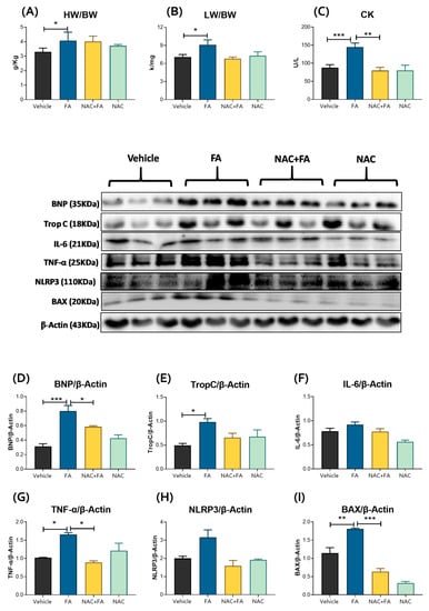 Heart damage markers. (A) HW/BW and (B) LW/BW ratios, (C) creatine kinase (CK) activity in the heart. Data are mean ± SEM, n = 5–6. Western blot representative images and their densitometries of proteins: (D) BNP, (E) Trop C, (F) IL-6, (G) TNF-α, (H) NRLP3 and (I) BAX in heart homogenates. β-Actin was used as loading controls. Data are mean ± SEM, n = 3. * p < 0.05, ** p < 0.01 and *** p < 0.001. BNP = brain natriuretic peptide, BW = body weight, HW = heart weight, LW = lung weight, Trop C = troponin C, IL-6 = Interleukin 6, TNF-α = tumor necrosis factor-alpha, NLRP3 = NLR family pyrin domain containing 3, BAX = Bcl-2-associated X, FA = Folic acid, NAC = N-acetyl-cysteine.