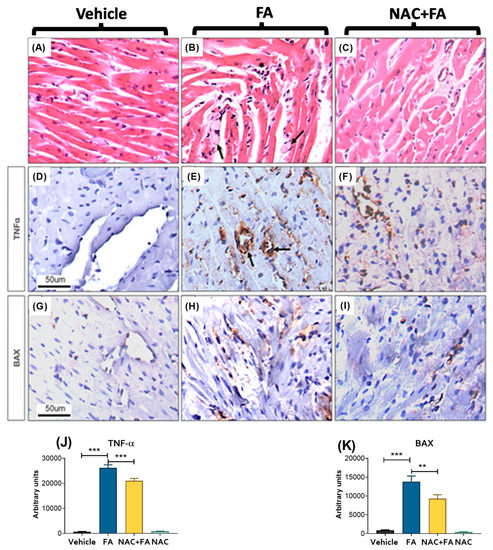 Representative micrographs of heart histology and TNF-alfa and BAX immunohistochemistry. (A) Normal heart histology of a rat from the control vehicle group. (B) FA-treated animal show groups of death cardiomyocytes with condensed nucleus and fragmented hyaline cytoplasm (arrows) and some interstitial lymphocytes (white asterisk). (C) NAC + FA treatment reduced tissue damage. (D) The control animal does not show TNF-alpha immunoreactivity. (E) In contrast, strong TNF-alpha immunoreactivity is seen in the cytoplasm of some myocardial and inflammatory cells; it is particularly intense in the endothelium of small blood vessels (arrows). (F) Rat treated with FA + NAC showed decreased TNF-alpha immunoreactivity; only the endothelium showed immunoreactivity. (G) The control rat does not show BAX immunoreactivity. (H) Numerous cardiomyocytes show BAX immunoreactivity in animals treated with FA. (I) Occasional myocytes show scare immunostaining to BAX in a rat from the NAC + FA group. Quantification of TNF-alpha (J) and BAX (K) immunoreactivity in the heart. The images used for quantification correspond to a size of area x field of 314,679.481 μm. Data are mean ± SEM, n = 7. ** p < 0.01, *** p < 0.001. BAX = Bcl-2 Associated X-protein, FA = Folic Acid, NAC = N-acetyl-cysteine, TNF-alpha = tumor necrosis factor alfa (All micrographs 400× magnification).