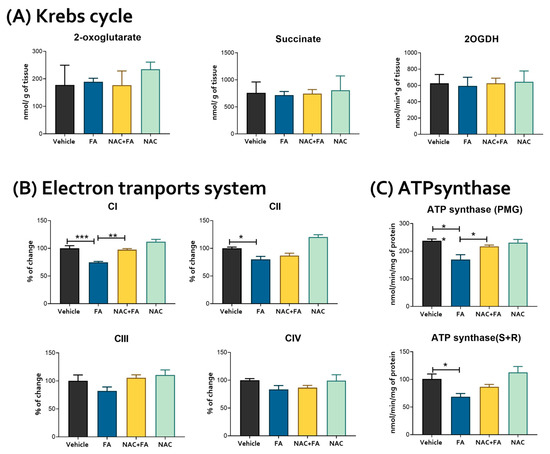 Heart mitochondrial bioenergetics. (A) Levels of the Krebs cycle intermediates 2-oxoglutarate and succinate and activity of 2-oxoglutarate dehydrogenase (2-OGDH) in heart homogenates. (B) The activity of respiratory complexes in isolated mitochondria from the heart: Complex I (CI), Complex II (CII), Complex III (CIII), Complex IV (CIV). (C) ATP synthase activity using PMG = pyruvate, malate, and glutamate and S + R = succinate plus rotenone as a substrate. Data are mean ± SEM, n = 5–6. * p < 0.05, ** p < 0.01, *** p < 0.001. FA = folic acid, NAC = N-acetyl-cysteine.