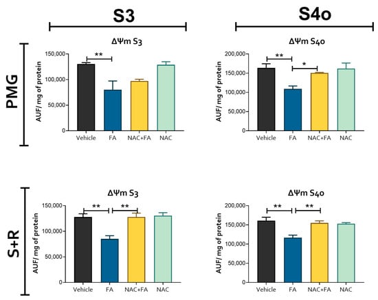 On the other hand, NAC pre-administration was able to prevent the reduction in mitochondrial CI activity (Figure 5B) and in ATP synthase activity when a CI-linked substrate (PMG) is used (Figure 5C) and partially prevented the ΔΨm membrane depolarization on both S3 and S4o induced by FA administration in the heart (Figure 6). Thus, these results indicate that the protective NAC effects on CRS would be related to its therapeutic effects in mitochondrial heart bioenergetics.