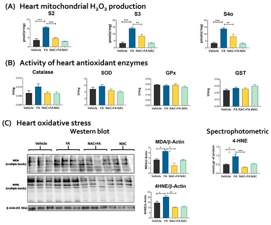 Oxidative stress. (A) Rate of mitochondrial hydrogen peroxide (H2O2) production. S2 = State 2, S3 = State 3, S4 = State 4. (B) Activity of antioxidant enzymes in heart homogenates: catalase, SOD = superoxide dismutase, GPx = glutathione peroxidase, and GST = glutathione S-transferase. Data are mean ± SEM, n = 5–6. (C) MDA and 4HNE lipoperoxidation markers evaluated by Western blot (mean ± SEM, n = 3) and by spectrophotometric technique (mean ± SEM, n = 5–6) in heart homogenates. MDA = malondialdehyde, 4HNE = 4-hydroxynonenal. β-Actin was used as a control charger. FA = folic acid, NAC = N-acetyl-cysteine. * p < 0.05, ** p < 0.01, *** p < 0.001.