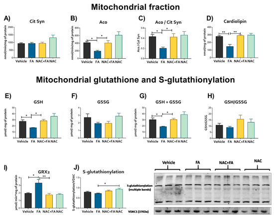 Mitochondrial stress markers. Activity of (A) citrate synthase (Cit Syn), (B) aconitase (Aco), (C) Aco/Cit Syn ratio, and (D) cardiolipin levels in isolated heart mitochondria. Levels of (E) GSH = glutathione, (F) glutathione disulfide (GSSG), (G) GSH plus GSSG, (H) GSH/GSSG ratio, (I) removal S-glutathionylation activity of the glutaredoxin 2 (GRX) and (J) total S-glutathionylation levels evaluated by Western blot and their densitometry in isolated mitochondria fraction. FA = folic acid, NAC = N-acetyl-cysteine. Data are mean ± SEM, n = 5–6. * p < 0.05 and ** p < 0.01.