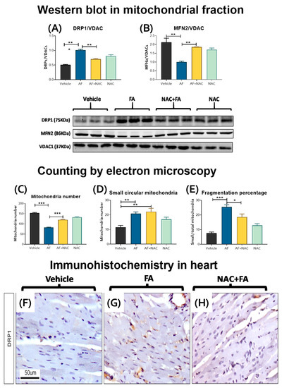 Mitochondrial bioenergetics impairment and oxidative stress may induce an imbalance in mitochondrial dynamics, favoring the mitochondrial network fragmentation (fission) over the joining of two or more mitochondria (fusion) [18,62,63]. Thus, to evaluate the changes in mitochondrial dynamics, we determined the levels of fission proteins DRP1 and FIS1 and fusion proteins MFN1, MFN2, and OPA1 in the heart mitochondria. The FA-treated group showed increased levels of the fission protein DRP1 (Figure 9A) without changes in FIS1 levels (Supplementary Figure S4). We observed a reduction in the MFN2 levels (Figure 9B). However, we did not observe significant changes in the levels of the other fusion proteins nor the mitochondrial protease LONP1 (Supplementary Figure S4). Interestingly, the electron microscopy evaluation showed a decrease in the mitochondrial number per cardiomyocytes in the FA group (Figure 9C and Figure 10B), an increase in the number of small, circular mitochondria per cardiomyocyte (Figure 9D), and in the ratio of small/total mitochondria (Figure 9E), thus suggesting a higher degree of mitochondrial fragmentation. These results were confirmed by immunohistochemistry, where the hearts from the FA group showed greater DRP1 immunostaining with respect to the vehicle (Figure 9F,G). The NAC + AF treated group showed a significant reversion of dynamic protein changes (Figure 9A,B), mitochondrial number (Figure 9C), and fragmentation percentage (Figure 9E), as well as less DRP1 immunostaining in cardiomyocytes (Figure 9H).