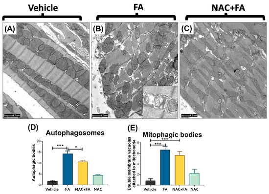 In comparison with the control group that showed cardiomyocytes with normal distribution and morphology of mitochondria and myofilaments array (Figure 10A), the cardiomyocytes of the FA group showed a higher number of small mitochondria with ovoid or circular morphology that corresponded to fission mitochondria (Figure 9D,E and Figure 10). In this FA group, many cardiomyocytes also showed a disarray of myofilaments and a higher number of autophagosomes (Figure 10B,D), as well as double membrane vacuoles attached to the mitochondria that correspond to mitophagy bodies (Figure 10B,E). The FA plus NAC group showed myocardial cells with long mitochondria characteristic of fusion mitochondria (Figure 10C), a lower number of small mitochondria (Figure 9D), and autophagosomes (Figure 10D). Summarizing, our results imply a slight shift of mitochondrial dynamics in the fission process in the hearts of FA-treated animals. On the other hand, NAC pretreatment prevented the FA-induced increase in DRP1 mitochondria levels (Figure 9A,G), increased MFN2 levels (Figure 9B), and preserved mitochondria structure (Figure 9C–E and Figure 10C).