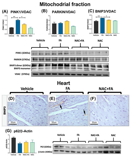 Finally, we previously demonstrated that FA induced an impaired mitophagy flux in the kidney, favoring the accumulation of damaged mitochondria [15]. Our results showed an increase in PINK1 and BNIP3 in heart mitochondria (Figure 12A,C), and parkin and p62 levels in the heart did not substantially change (Figure 12B,G). However, the autophagosome number increase in myocardial cells observed by the electron microscopy (Figure 10) suggested an impaired mitophagy flux. Although more studies using autophagy inhibitors are still necessary to elucidate the state of autophagy flux in this model, the restoration of levels by NAC (Figure 10 and Figure 12) suggests that oxidative stress and GSH depletion could be directly involved in these alterations.
