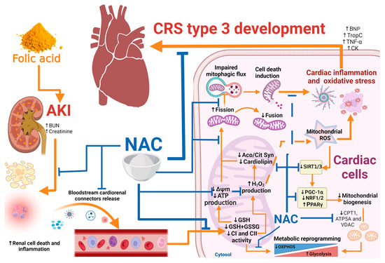 Integrative scheme. After its administration, FA induces AKI, favoring inflammatory and cell death processes in kidney segments like the proximal tubule. This triggers the release to the bloodstream of cardio-renal connectors, which can reach the heart cells. Thus, cardio-renal connector interaction with cardiac cells induces mitochondrial impairment by GSH and GSH + GSSH depletion in this organelle and CI and CII activity reduction, triggering a drop in ATP production and ΔΨm. Additionally, the complexes alteration in the mitochondrial heart triggers a H2O2 production increase, resulting in mitochondrial oxidative stress and a reduction in cardiolipin levels, which together with ΔΨm loss induce mitochondrial impairment in mitophagy flux, favoring mitochondrial damage accumulation and cell death induction. Likewise, mitochondrial ROS reduce SIRT1/3 levels inducing a reduction in mitochondrial biogenesis factors and decreasing mitochondrial proteins CPT1, ATP5A, and VDAC. Together, these alterations favor the energetic metabolic reprogramming in the heart. On the other hand, mitochondrial bioenergetic alterations and oxidative stress enhance the heart’s proinflammatory processes and cell death, ultimately leading to the CRS type 3 development in this model. In contrast, NAC pre-administration prevents inflammatory and cell death processes in kidney and cardio-renal connectors increase. NAC also prevents heart mitochondrial bioenergetics alliterations, preserving ATP and ΔΨm by CI activity and glutathione balance preservation, thus preventing the mitochondrial dynamics shift to fission and decreasing biogenesis and mitochondrial mass in the heart. By mitochondrial preservation, NAC administration prevented inflammatory and cell death markers in the heart and cardiac oxidative stress, thus preventing CRS type 3 development in FA-AKI. Aco = aconitase; AKI = acute kidney injury; ATP = adenosine triphosphate; ATP5A1 = ATP synthase subunit 5 A; BNP = brain natriuretic peptide; BUN = blood urea nitrogen; CI = Complex I; CII = Complex II; Cit Syn = citrate Synthase; CPT1 = carnitine palmitoyltransferase 1A, CK = creatine kinase; CRS = cardio-renal syndrome; FA = folic acid; GSH = reduced glutathione; GSSG = glutathione disulfide; H2O2 = hydrogen peroxide; NAC = N-acetyl-cysteine; NRF1 = nuclear respiratory factor 1; NRF2 = nuclear respiratory factor 2; OXPHOS = oxidative phosphorylation; PGC-1α = peroxisome proliferator-activated receptor-gamma coactivator; PPARγ = peroxisome proliferator-activated receptor gamma; ROS = reactive oxygen species; SIRT1 = sirtuin 1; SIRT3 = sirtuin 3; TNF-α = tumor necrosis factor-alpha; Trop C = troponin C; VDAC = voltage-dependent anion channel; ΔΨm = mitochondrial membrane potential.