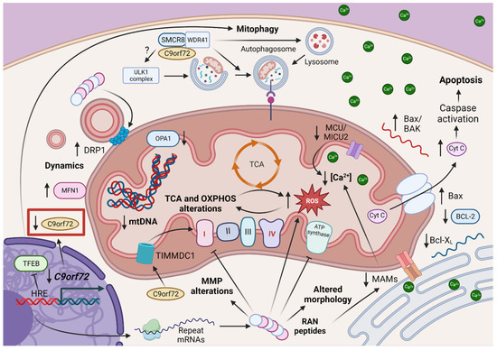 Mitochondrial alterations associated with C9orf72 HRE pathogenesis. A 50% reduction in mtDNA has been observed in C9orf72 prefrontal cortex samples. The HRE provokes a reduction in C9orf72 protein levels, which affects C9orf72 function. For example, C9orf72 prevents the degradation of mitochondrial transporter TIMMDC1, which participates in OXPHOS complex I formation. Dysfunctions in complexes I and IV have been reported in C9orf72 HRE samples. Consequently, ROS levels are increased. Ca2+ cytosolic levels are incremented, but defects in mitochondrial Ca2+ uptake associated with MCU and MICU2 decrease have been reported. HRE-containing mRNAs which reach the cytoplasm may be translated into DPR RAN peptides, affecting mitochondrial homeostasis at different levels. For example, poly-GA, poly-GR and poly-PR DPRs impair MAMs formation. Poly-GR expression alters MMP, increases DRP1 and decreases OPA1 protein levels (although MFN1 seems to be upregulated) and impairs complex I and ATP synthase activity (the latter one by favoring ATP5A1 degradation). Additionally, DPRs alter mitochondrial morphology and increase ROS levels. The reduction of C9orf72 protein alters mitophagy initiation and possibly lysosomal degradation. Moreover, expanded transcripts disrupt TFEB function. Furthermore, Bax mRNA and protein levels are exacerbated in C9orf72 samples. In addition, reduced Bcl-2 and Bcl-XL mRNA was observed, paired with higher BAK mRNA levels and cytochrome c mitochondrial release.