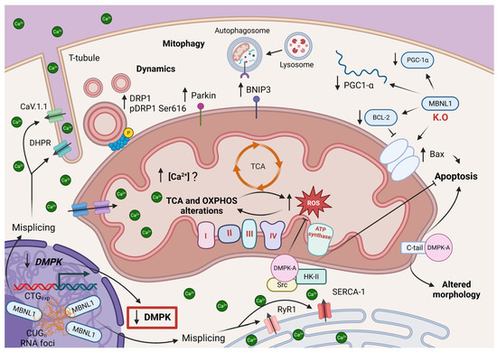 Mitochondrial alterations associated with DM1. A reduction in all OXPHOS complexes and ATP synthase gene and protein levels has been reported in DM1 muscles samples. Indeed, higher ROS generation has been found in DM1 patient fibroblasts. Elevated DRP1 and phosphor-DRP1 (Ser616) have been reported, as well as more BNIP3 and Parkin. Defects in MBNL1 splicing caused by expanded repeats mRNA molecules result in altered CaV.1., SERCA-1, DHPR and RyR1, leading to an increase in cytosolic Ca2+ levels which may affect mitochondrial Ca2+ concentration. The CTG expansion also decreases DMPK expression, meaning a reduction in its function. DMPK-A forms a complex with Src and HK-II which prevents ROS formation and protects cells from apoptosis. However, DMPK-A C-terminus tail may be responsible of altered mitochondrial morphology and mitochondrial perinuclear clustering, ultimately leading to apoptotic cell death. Finally, a study on a MBNL1 knockout model showed an increase in Bax/Bcl-2 ratio and decreased PGC-1α mRNA and protein levels.