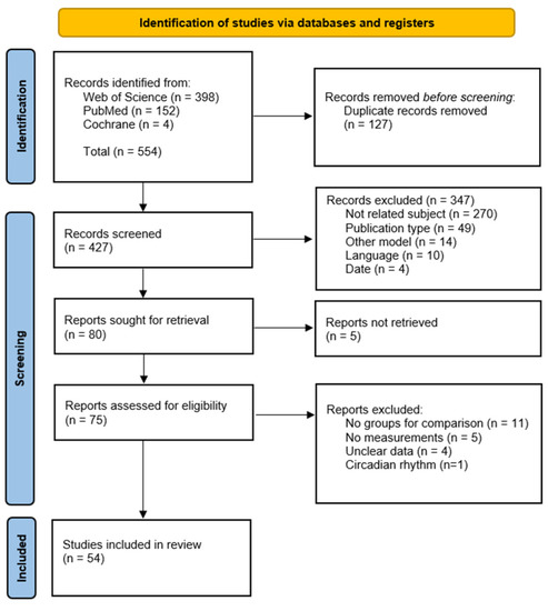 A total of 54 studies were included in the qualitative analysis. Multiple sleep deprivation protocols were used, such as MSP (multiple small platforms), CP (classical platform/inverted flowerpot), DOW (Disk over water), GH (Gentle handling) and ASD (automated sleep deprivation). Comprehensive descriptions of the mentioned sleep deprivation protocols and respective control groups have been previously reviewed [9,24,25].