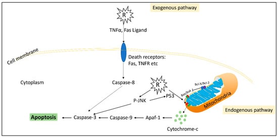 Simplified diagram of reactive oxygen species (R˙)-induced apoptosis. Exogenous pathway: Free radicals induce death receptors such as the TNF receptor (TNFR) or FAS receptor, as well as inducing the production of their ligands TNFα and FasL (respectively) from neighbouring cells. The death receptors stimulate caspase-8, which activates apoptosis. Intrinsic pathway: cellular free radicals, such as H2O2, result in mitochondrial dysfunction via the Bax/Bak leaking of cytochrome-c from the mitochondria, which activates apoptosis via the caspase complex. Cellular free radicals also result in the phosphorylation of JNK (P-JNK) and P53, which leads to further activation of apoptosis.