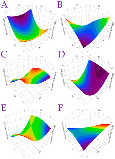 | Ascorbic acid | Y = 3.96 − 0.26X1 − 1.51X2 + 0.8X3 + 0.12X4 + 0.08X12 + 0.2X22 − 0.02X32 − 0.07X42 + 0.01X1X2 − 0.13X1X3 + 0.06X1X4 + 0.03X2X3 + 0.13X2X4 − 0.16X3X4 | 0.9725 | 0.0056 | (14) |