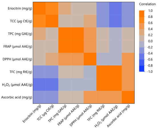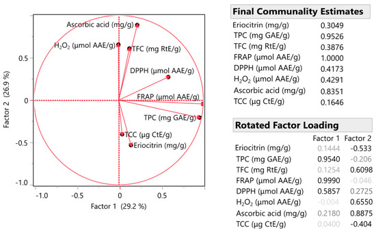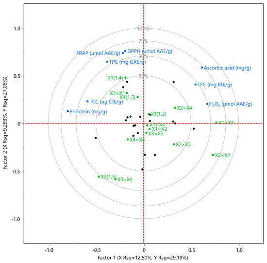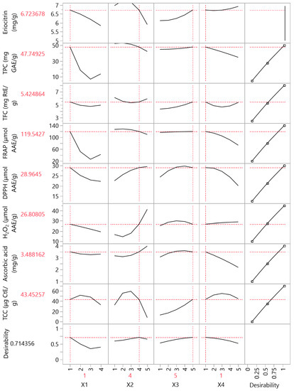 | X1 | X2 | X3 | X4 | Eriocitrin (mg/g) | TPC (mg GAE/g) | TFC (mg RtE/g) | FRAP (μmol AAE/g) | DPPH (μmol AAE/g) | H2O2 (μmol AAE/g) | Ascorbic Acid (mg/g) | TCC (μg CtE/g) | |