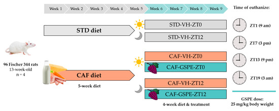 Figure 1. Experimental design. Ninety-six Fischer 344 rats were randomly divided into two groups based on their diet: 32 were fed STD and 64 were fed CAF for 5 weeks. Then, each diet group was further divided into two groups for STD-fed rats and four groups for CAF-fed rats, to receive either VH or GSPE doses. Both STD and CAF-fed rats were administered VH at two different time points: 8 a.m. (ZT0) and 8 p.m. (ZT12), while CAF-fed rats were additionally given GSPE (25 mg/kg b.w.) at the same time points. Finally, each experimental group was subdivided into four based on the time of death of the animals: 9 a.m. (ZT1), 3 p.m. (ZT7), 9 p.m. (ZT13), and 3 a.m. (ZT19).