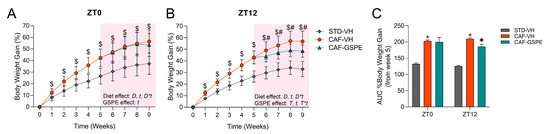 Figure 2. Body weight gain (% to Week 0). (A) Body weight gain was expressed in the percentage of ZT0-treated rats (STD-VH, CAF-VH, and CAF-GSPE) during the nine weeks of the experiment. (B) Body weight gain was expressed in the percentage of ZT12-treated rats (STD-VH, CAF-VH, and CAF-GSPE) during the nine weeks of the experiment. Data are shown as mean ± S.D (n = 14–16). $ indicates significant differences by Student’s t-test between STD-VH vs. CAF-VH (p < 0.001). # indicates significant differences by Student’s t-test between CAF-VH vs. CAF-GSPE (p < 0.001). t, indicates time effect; D, diet effect, D*t, interaction between diet and time, T, indicates treatment effect, and T*t, interaction between treatment and time via 2-way ANOVA. (C) AUC of the percentage of the BWG from week 5. Data are shown as mean ± S.E.M (n = 14–16). + indicates significant differences by Student’s t-test between STD-VH vs. CAF-VH (p < 0.05). * Indicates significant differences by Student’s t-test between CAF-VH vs. CAF-GSPE (p < 0.05). STD, rats fed a Standard diet; CAF, rats fed a Cafeteria diet; VH, rats administered vehicle; GSPE, rats administered 25 mg/kg b.w. grape seed proanthocyanidin extract.