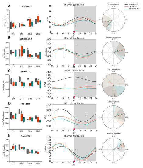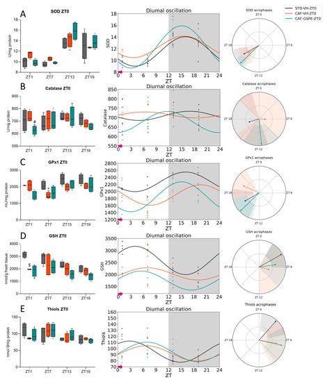 Regarding ZT0-treated rats, all groups showed diurnal rhythmicity on SOD activity (p = 0.01, STD-VH; p = 0.002, CAF-VH and p < 0.000, CAF-GSPE) peaking at almost the same time, between ZT15 and ZT16 (Figure 3A, Table 3). However, GSPE-treated rats showed a higher acrophase, indicating that the treatment increased the activity of the enzyme. On the other hand, we also observed that while Catalase activity did not show any diurnal rhythm in either STD-VH or CAF-VH (Figure 3B), it tended to present a diurnal rhythm in the CAF-GSPE group (p = 0.088). Furthermore, its activity exhibited an amplitude almost 2-fold higher than that reached in the STD-VH group (Table 3), suggesting an enhanced AOX response in the organism. Furthermore, in relation to GPx1 activity (Figure 3C), all three groups (STD-VH, CAF-VH, and CAF-GSPE) showed diurnal rhythmicity (p = 0.027, p = 0.033, p = 0.024, respectively). It is worth highlighting that the STD-VH and CAF-GSPE groups reached their zenith at approximately the same time (ZT15 and ZT16, respectively), while the CAF-VH group did the same at almost ZT20 (Table 3). This suggests that the CAF shifted the acrophase, but GSPE treatment was able to restore the amplitude observed in the STD-VH group. Regarding GSH, the main AOX compound in cells, the STD-VH group showed diurnal rhythmicity (p = 0.001) while the CAF-VH group lost this rhythmicity due to the diet (Figure 3D). Nevertheless, CAF-GSPE-treated rats tended to recover the rhythmicity (p = 0.063), showing a profile similar to the STD-VH (Table 3). In this regard, only the STD-VH group showed diurnal rhythmicity in thiols (p = 0.039). Surprisingly, CAF-GSPE tended to recover the rhythmicity in thiols (p = 0.052) but its acrophase shifted for almost 4 h compared to the STD-VH group (Figure 3E).