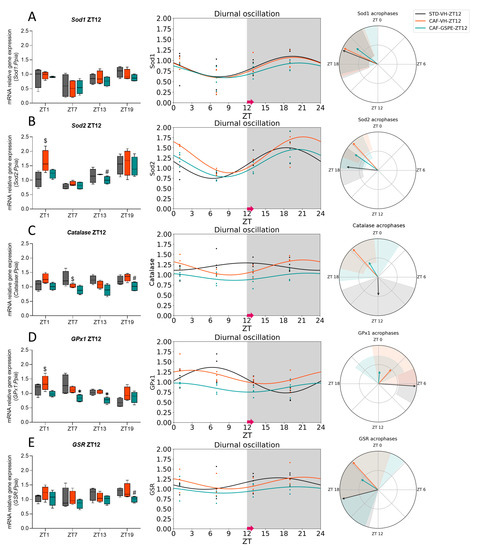 Figure 6. Estimated diurnal rhythms of liver Sod1 (A), Sod2 (B), Catalase (C), GPx1 (D), and GSR (E) gene expression in ZT12-treated rats. Data are shown as the median ± Min to max, its diurnal oscillation, and acrophases with their amplitude. $ indicates tendency (0.1 > p ≥ 0.05) by diet effect (STD-VH vs. CAF-VH); * indicates significant differences (p < 0.05) by treatment effect (CAF-VH vs. CAF-GSPE), # indicates tendency (0.1 > p ≥ 0.05) by treatment effect using Mann–Whitney U test. STD, rats fed a Standard diet; CAF, rats fed a Cafeteria diet; VH, rats administered vehicle; GSPE, rats administered 25 mg/kg b.w. grape seed proanthocyanidin extract; Arrow, time of treatment administration.