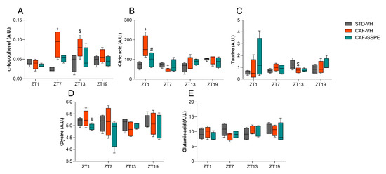 Figure 7. Hepatic levels of (A) α-tocopherol, (B) citric acid, (C) taurine, (D) glycine, and (E) glutamic acid of rats treated at ZT0. Data are shown as the median ± Min to max (n = 4). + indicates significant differences (p < 0.05) by diet effect (STD-VH vs. CAF-VH), $ indicates tendency (0.1 > p ≥ 0.05) by diet effect; # indicates tendency (0.1 > p ≥ 0.05) by treatment effect (CAF-VH vs. CAF-GSPE) using Mann–Whitney U test. STD, rats fed a Standard diet; CAF, rats fed a Cafeteria diet; VH, rats administered vehicle; GSPE, rats administered 25 mg/kg b.w. grape seed proanthocyanidin extract, A.U., arbitrary units.