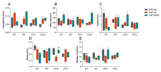 Figure 8. Hepatic levels of (A) α-tocopherol, (B) citric acid, (C) taurine, (D) glycine, and (E) glutamic acid of rats treated at ZT12. Data are shown as the median ± Min to max (n = 4). + indicates significant differences (p < 0.05) by diet effect (STD-VH vs. CAF-VH), $ indicates tendency (0.1 > p ≥ 0.05) by diet effect; * indicates significant differences (p < 0.05) by treatment effect (CAF-VH vs. CAF-GSPE) using Mann–Whitney U test. STD, rats fed a Standard diet; CAF, rats fed a Cafeteria diet; VH, rats administered vehicle; GSPE, rats administered 25 mg/kg b.w. grape seed proanthocyanidin extract, A.U., arbitrary units.