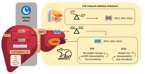 In this regard, other authors have also shown that the beneficial effect of bioactive compounds on the liver could be attributed in part to their ability to modulate circadian rhythms [31,78]. In this sense, Qi et al. demonstrated that tea polyphenols exert their beneficial effects on the oxidative status of hepatocytes by improving Bmal1 expression [85]. More concisely, the authors showed that tea polyphenols behaved as a Bmal1-enhancing natural compound resulting in the alleviation of the redox imbalance by strengthening the KEAP1/NRF2 AOX defense pathway, and an amelioration of the mitochondrial dysfunction in a Bmal1-dependent manner. In agreement with these results, our group has previously described the time-of-day-dependent effect of GSPE on the diurnal rhythms of clock genes, as well as on mitochondrial dynamics and mitochondrial complex activity in the livers of both STD- and CAF-fed rats [70]. In more detail, treatment with GSPE at ZT0 restored the activity of the mitochondrial complexes, highly affected by the CAF, while GSPE at ZT12 was able to restore the diurnal rhythms of some clock genes such as Bmal1 or Rorα, also altered by the CAF. Therefore, it is possible to speculate that the restoration of the diurnal rhythms of the clock genes by GSPE in the liver, as well as mitochondrial functionality, could also be related to the restoration of the diurnal rhythms of AOX enzyme activities, oxidative markers, and gene expression shown in our study, as circadian rhythms and oxidative stress are linked bidirectionally [86].