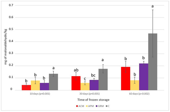 Lipid peroxidation (mg malonaldehyde/kg) in the fillets of tilapias fed the experimental diets at different times of storage at −20 °C (means ± standard deviation). ACM = diet with 5% acerola meal; APM = diet with 5% apple meal; GRM = diet with 5% grape meal; C = control diet; bars followed by different letters differ significantly by Tukey’s test (p < 0.05).