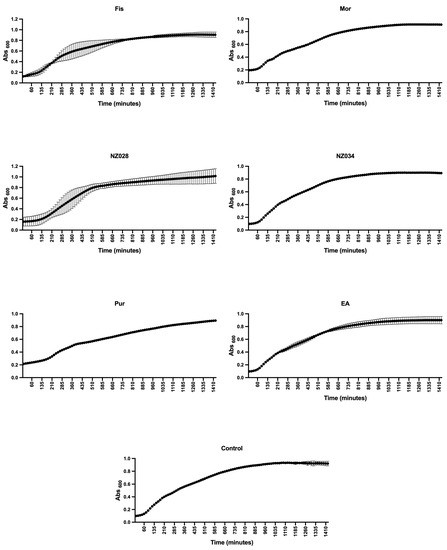 3.2. Growth Curves with and without the Selected Compounds