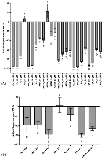 Panel (A) displays the antibiofilm effect (%) of the single molecules at different non-lethal concentrations against the E. coli wild-type (WT) strain. Panel (B) shows the antibiofilm effects (%) of various combinations of the selected molecules at the lowest concentration of 0.5 μM on the WT E. coli strain. To quantify the antibiofilm effect, percentage values were calculated by comparing the treated samples with their corresponding control samples. Negative values indicate a reduction in cell adhesion, while positive values a promotion of cell adhesion. The data presented represent the mean ± standard deviation obtained from independent measurements. Different letters indicate statistically significant differences (Tukey’s HSD, p ≤ 0.05) between different conditions.