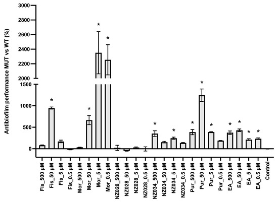 Comparison between the antibiofilm performance of the wild-type (WT) and WrbA-deprived mutant (MUT) strains. To quantify the antibiofilm effect of the molecules against the ∆wrbA mutant strain, the percentage decrease (indicated by negative values) or increase (indicated by positive values) in the number of adhered cells compared to the respective WT groups was determined. The data presented represent the mean ± standard deviation obtained from independent measurements. The asterisks indicate statistically significant differences (Tukey’s HSD, p ≤ 0.05) from the control samples.
